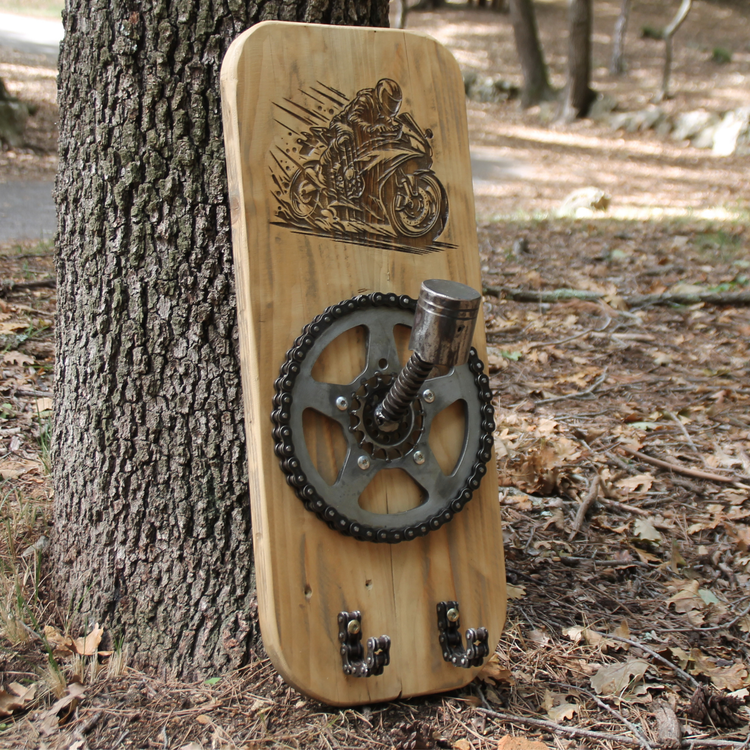 Chaque support de casques moto est unique de part sa gravure et les pièces recyclées utilisées. Pour un casque, ou deux casques, choisissez un porte casque moto original qui respectera vos mousses sans les déformer.